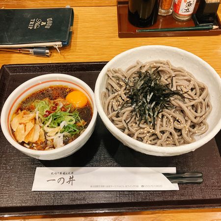 当初はラーメンかなぁなどと思っていたのですが、一番奥まったところにこちらの蕎麦屋さんがあり、ホワイトボードに貼ってあった「旨から肉そば」というのがあったのでそれをいただきました。