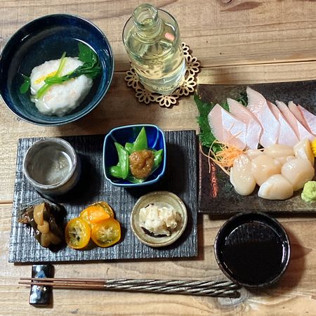 向付は買い物に行った先がブリしかいいものがなかったので、冷凍庫からホタテ。